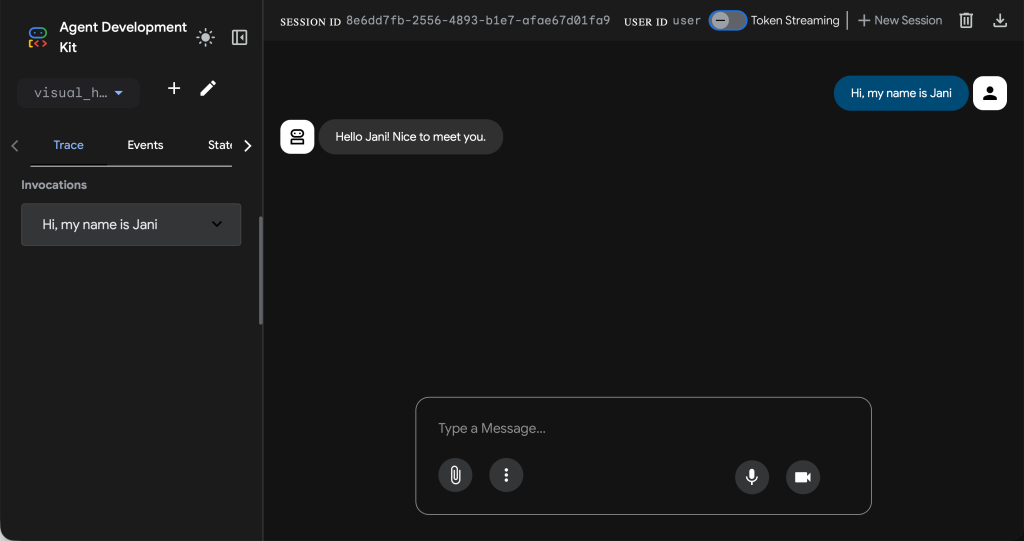 Running agent hello_agent, type exit to exit. [user]: Try these interactions: [user]: Hello, my name is Jani [user]: What can you do? [user]: Tell me about yourself