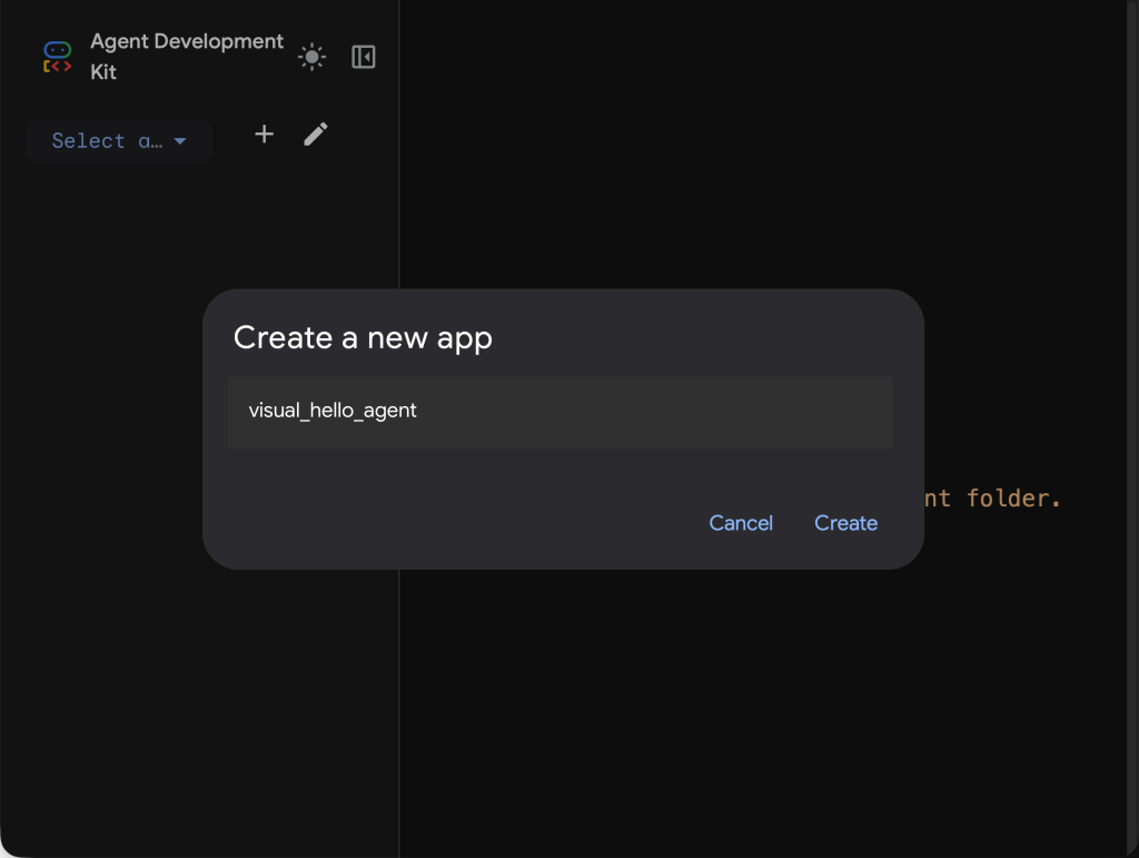 点击下拉菜单旁边的“+”按钮,输入名称 visual_hello_agent: