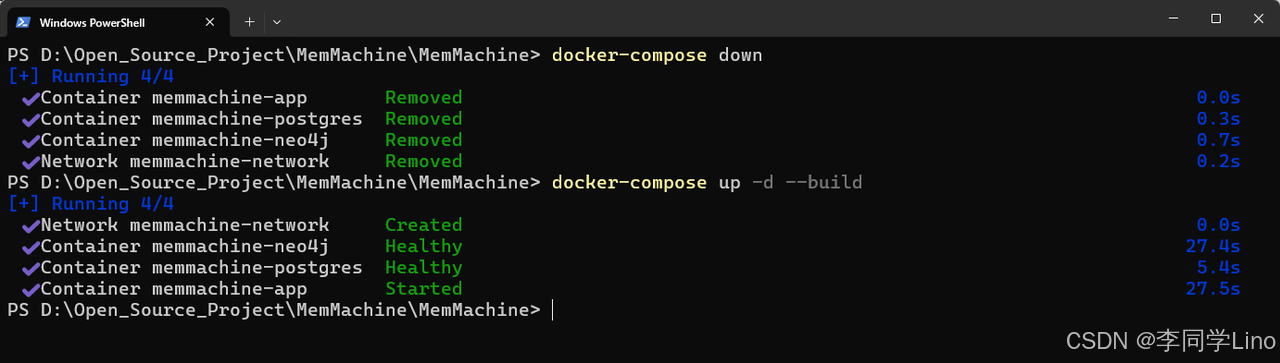 在修改完配置文件和环境变量后,一定要重新构建并启动 MemMachine 服务,使最新的配置生效。请进入项目目录:D:\Open_Source_Project\MemMachine\MemMachine,然后依次运行以下两条命令: