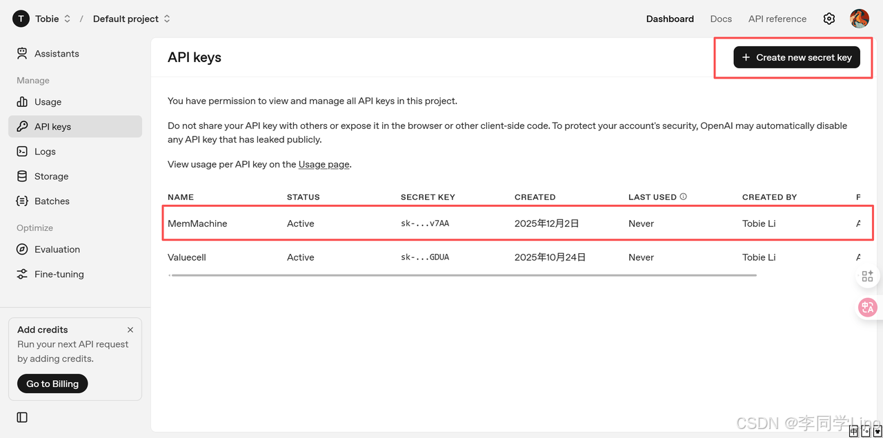在配置 MemMachine 的模型服务之前,我们需要先在中转 API 平台申请一个可用的 API Key,用于替代 OpenAI 的原生 Key。只需要简单几步,即可完成授权与配置。