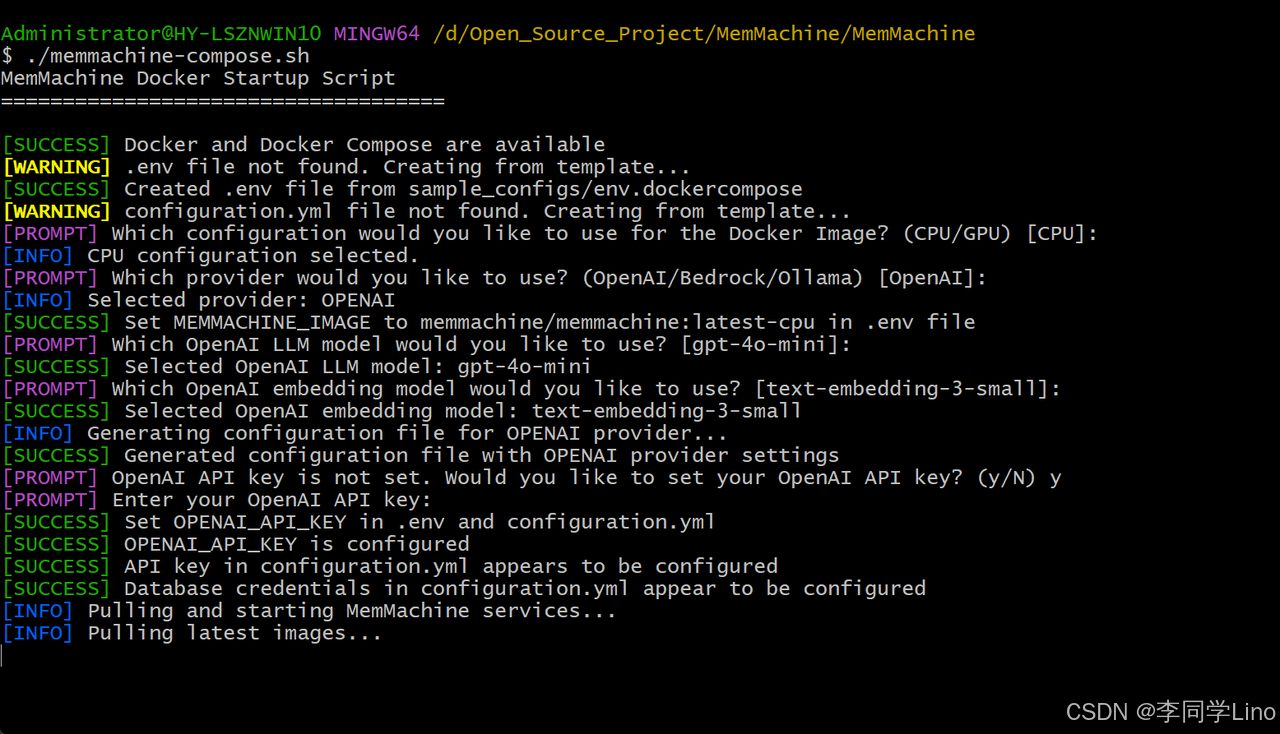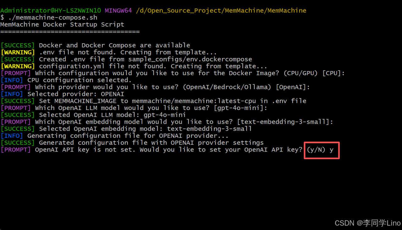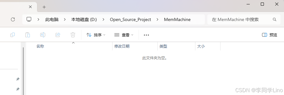 如果API也有了,我们就可以正式开始部署了。接着我们需要创建一个文件夹,这里创建了一个MemMachine文件夹,比如我的路径如下:“D:\Open_Source_Project\MemMachine”
