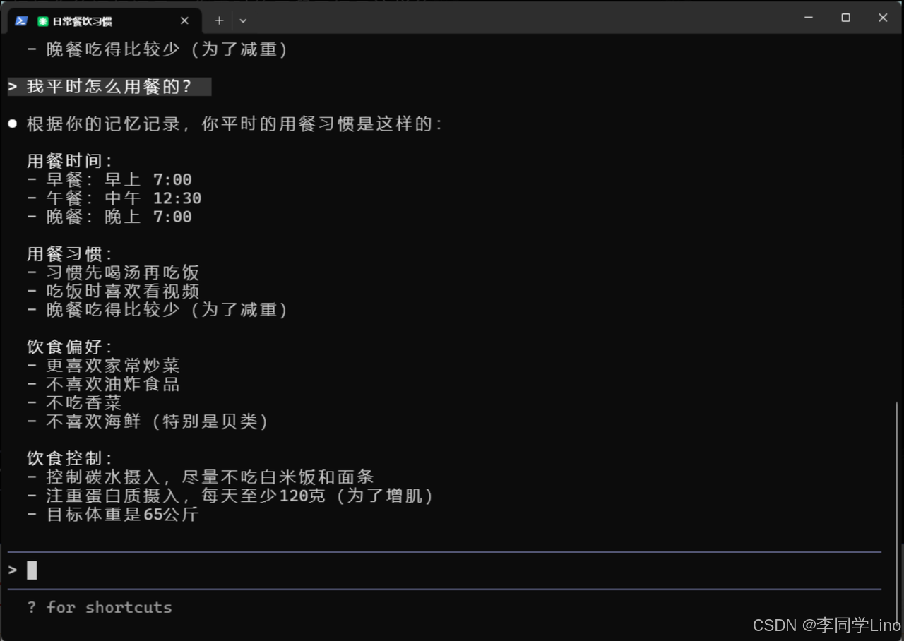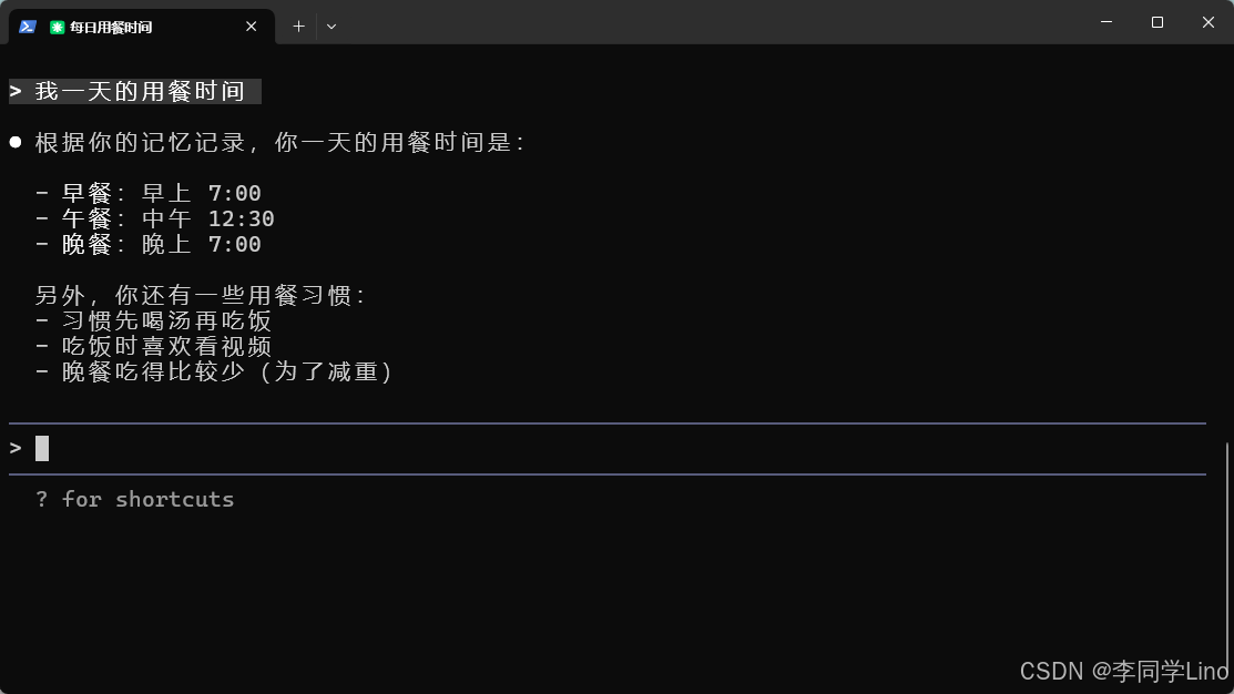 然后我们关掉这个终端命令,重新打开一个,又进行提问。比如:我一天的用餐时间