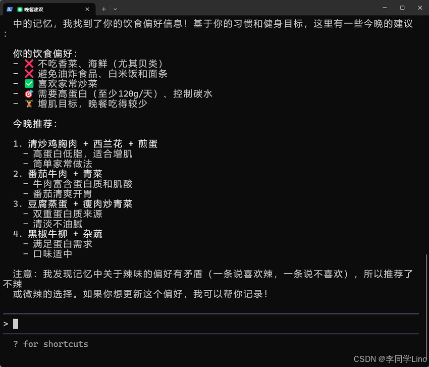 从喜好口味、忌口食材,到三餐作息、营养目标、减脂计划,我把一整段像现实生活中“第一次自我介绍”那样的信息交给了 Claude Code,让它通过 MemMachine 自动解析、提取并写入档案记忆。在传统的 LLM 中,这些内容通常会随着窗口关闭而消失,但这一次结果完全不同:当我隔天再次打开对话、随口问一句“今晚吃什么比较好?”它不仅记得我喜欢辣、不吃香菜、控制碳水,还能根据增肌目标反推蛋白质摄入建议——而这些信息,是在昨天的另一场会话里告诉它的。
