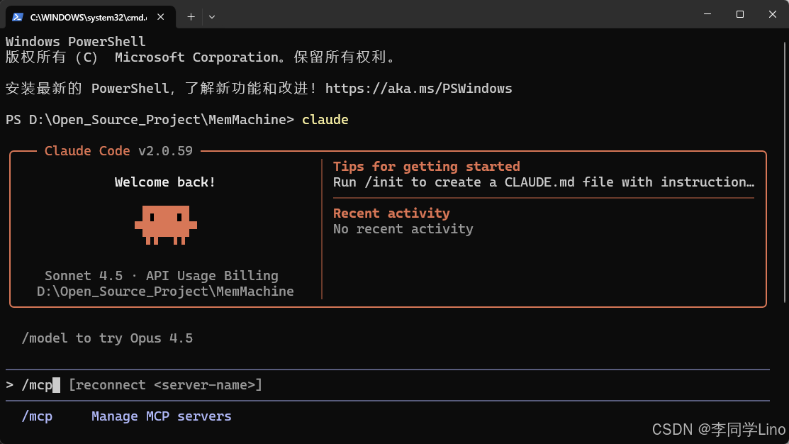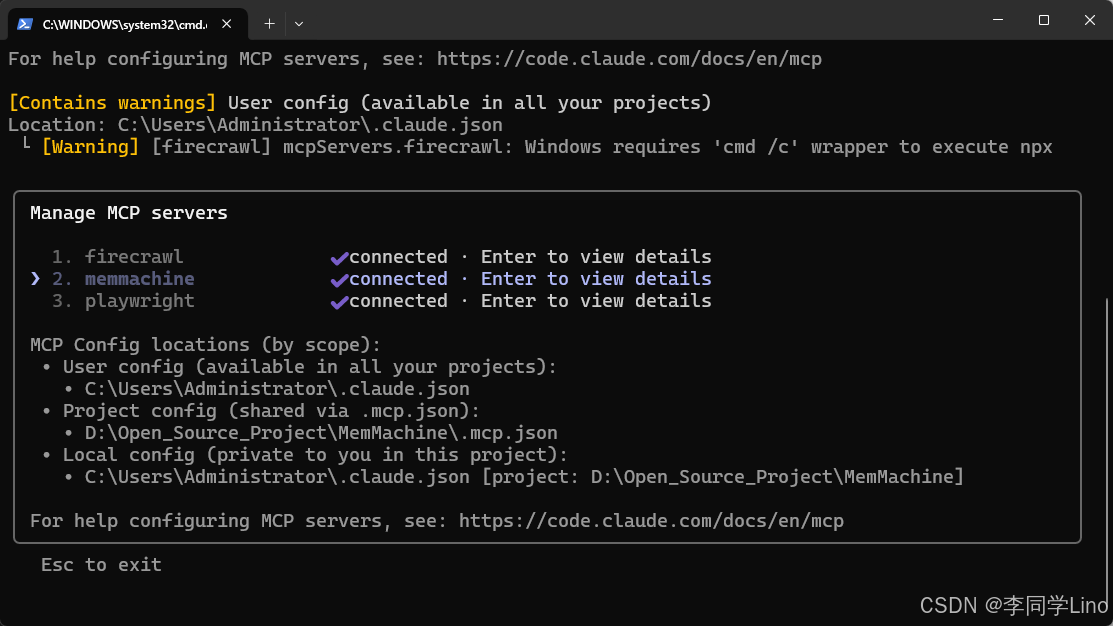 进入到Claude界面中,输入“/mcp”,可以看到,MemMachine已经记录到了Claude里面了。