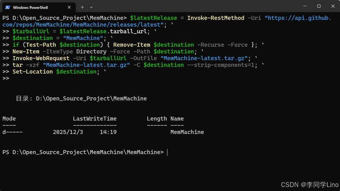 Invoke-WebRequest -Uri $tarballUrl -OutFile "MemMachine-latest.tar.gz"; `