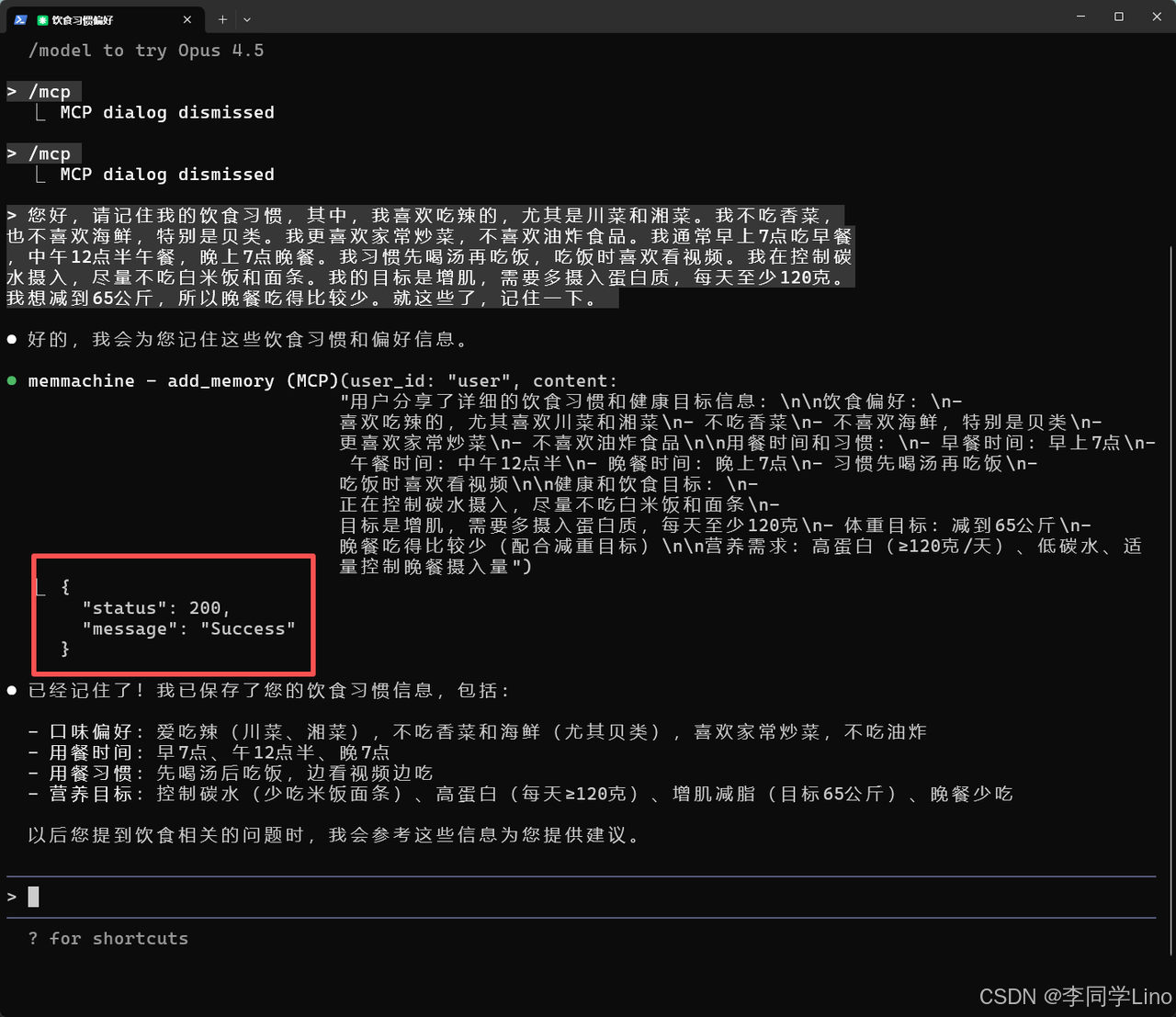 发送后,Claude 会自动调用 MemMachine,将这些内容拆解成“偏好”“禁忌”“作息”“营养目标”等结构化字段,并写入 Profile Memory。稍后我们会关闭会话,再通过一个新的对话验证,这些信息是否真的被长期记住并能被智能调用。