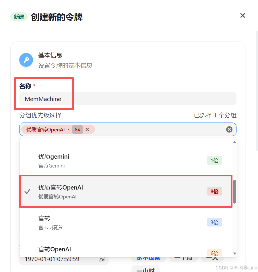 创建令牌时,“名称”可以随意填写,例如我填写的是 MemMachine。 “分组”建议选择 优质官转OpenAI,接着我们会在 MemMachine 的配置文件中填写模型名称,中转平台会根据模型自动路由到正确的接口。