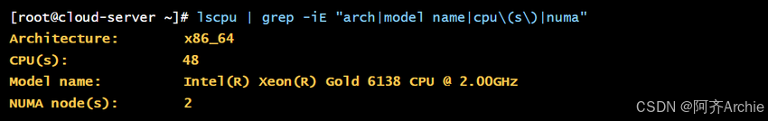 lscpu | grep -iE "arch|model name|cpu\(s\)|numa"