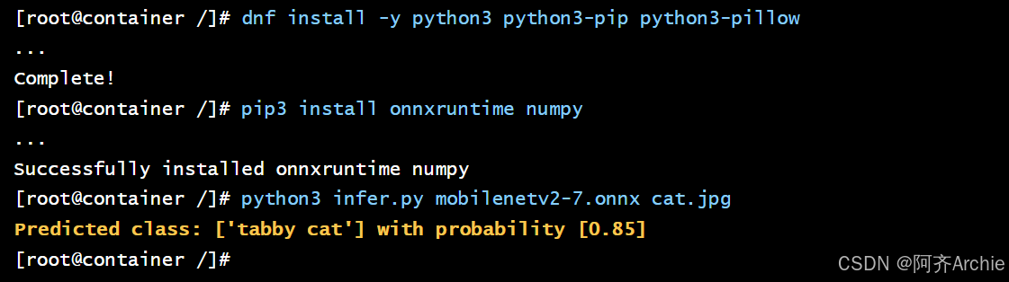 # 2. 准备模型和测试脚本 (此处省略下载 MobileNet ONNX 模型和编写推理脚本的步骤)# python3 infer.py mobilenetv2-7.onnx cat.jpg# 3. 执行推理