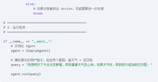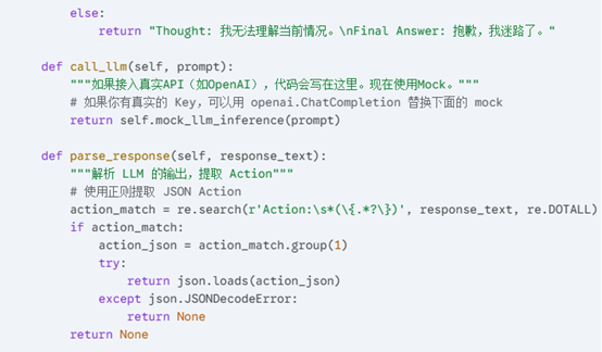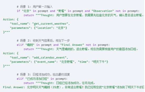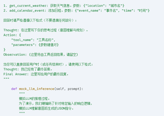 一旦替换了这个函数,Agent 就能够处理任何未见过的指令,自动分析意图并调用你定义的工具,而不需要像mock_llm_inference那样写死逻辑。