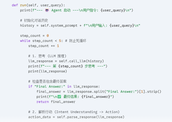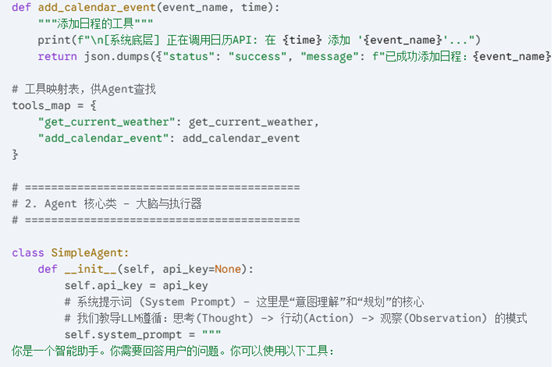 本文不依赖庞大的第三方框架(如LangChain),而是从零手写一个精简的ReAct模式的Agent框架。这样你可以清楚地看到代码底层是如何通过Prompt Engineering(提示词工程)和Python逻辑来实现这些“智能”行为的。