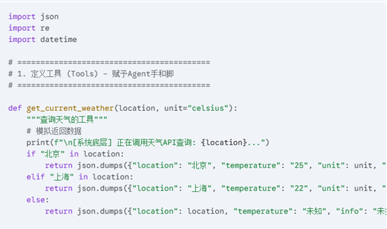 run方法)负责解析这个JSON,找到对应的Python函数 (get_current_weather) 并真正执行它。 -