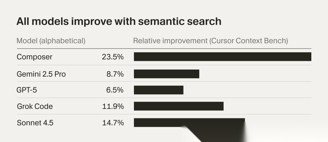 - [Cursor] 语义搜索显著提升工程可用性。未启用语义搜索时,不满意的后续用户请求增加约 2.2%;启用后代码留存率整体 +0.3%,在 ≥1000 文件的大型代码库中提升至 +2.6%。