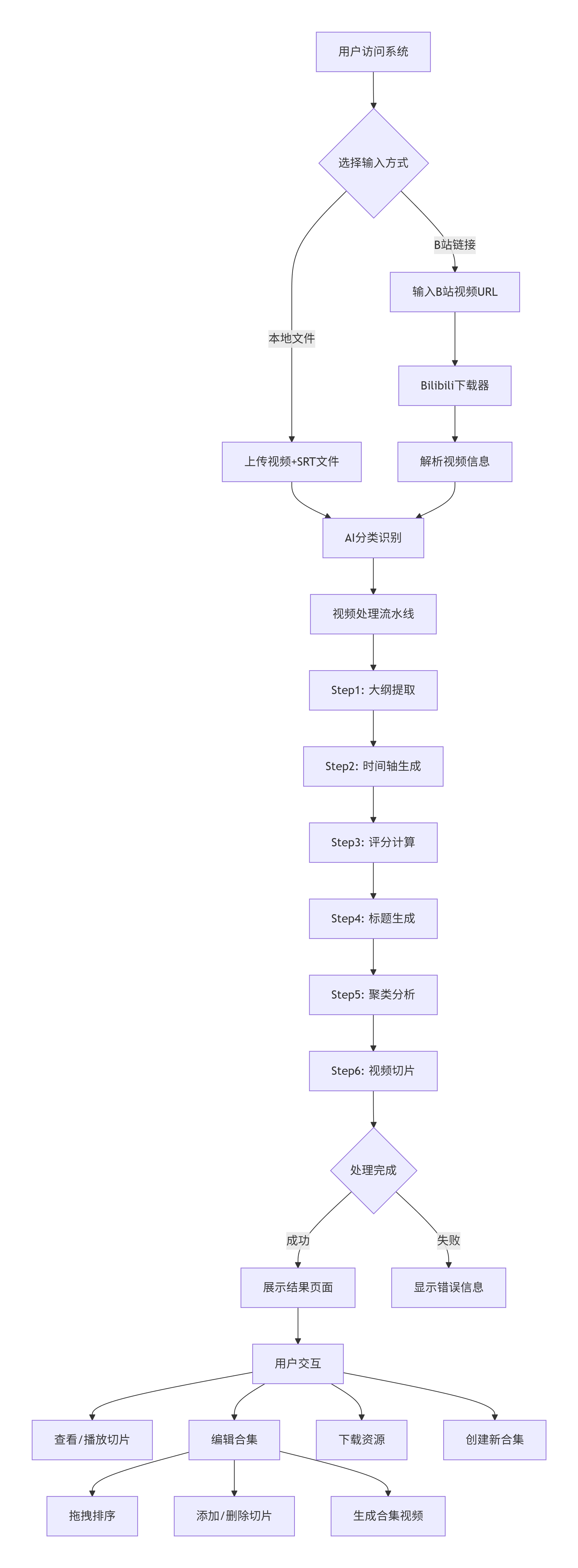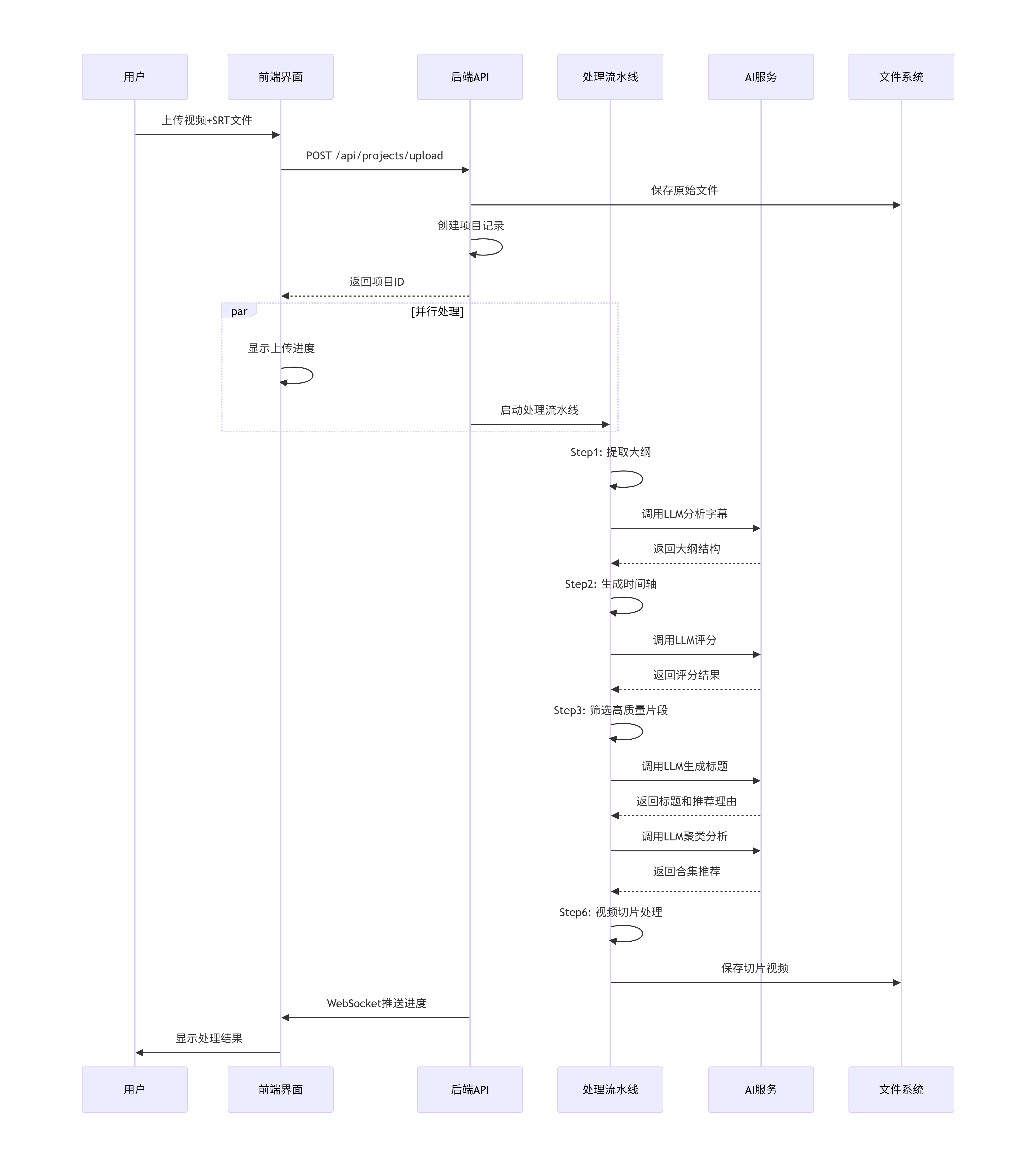 这个架构展示了AutoClip从视频输入到智能切片输出的完整流程,涵盖了用户交互、后台处理、AI分析和文件操作等多个维度