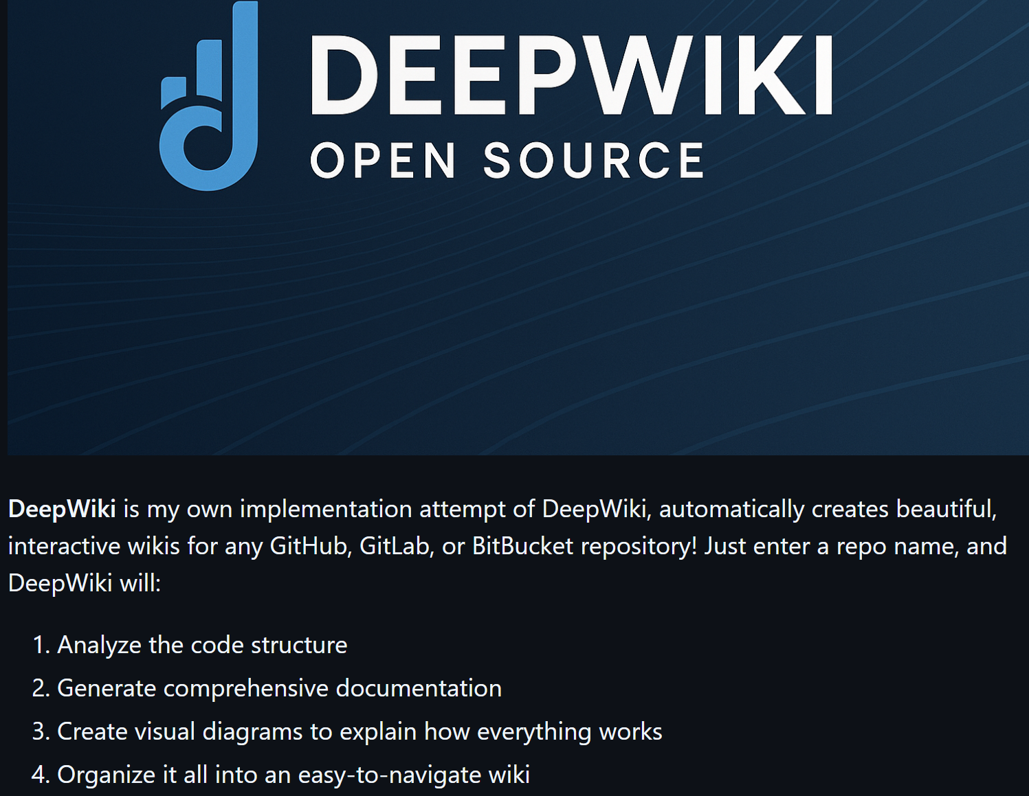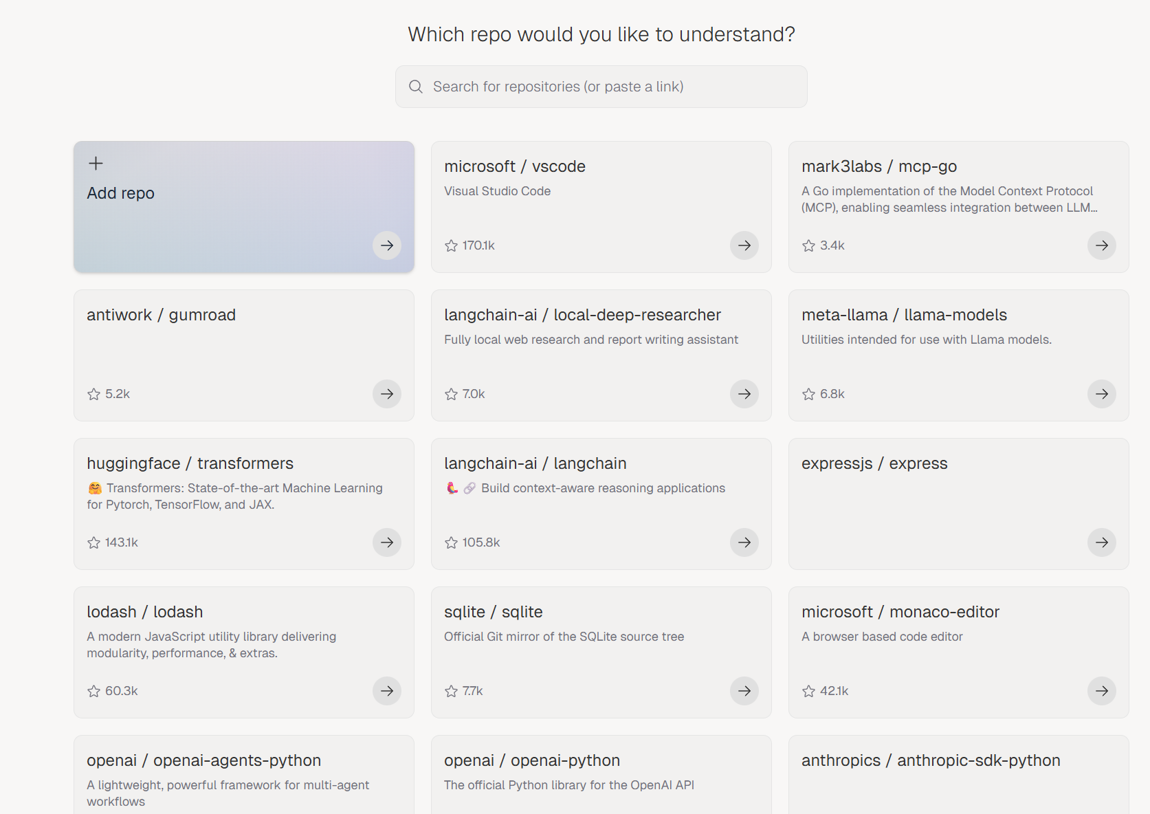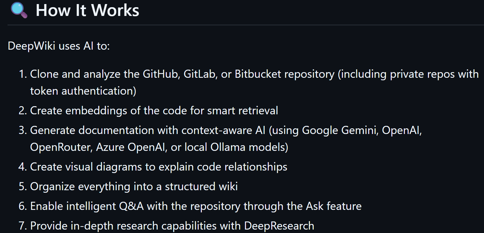 这一类是最近几年随着LLM(GPT,Claude,Gemini等)爆发而出现,核心逻辑是将整个仓库Embedding化,然后允许用户提问或自动生成文档。