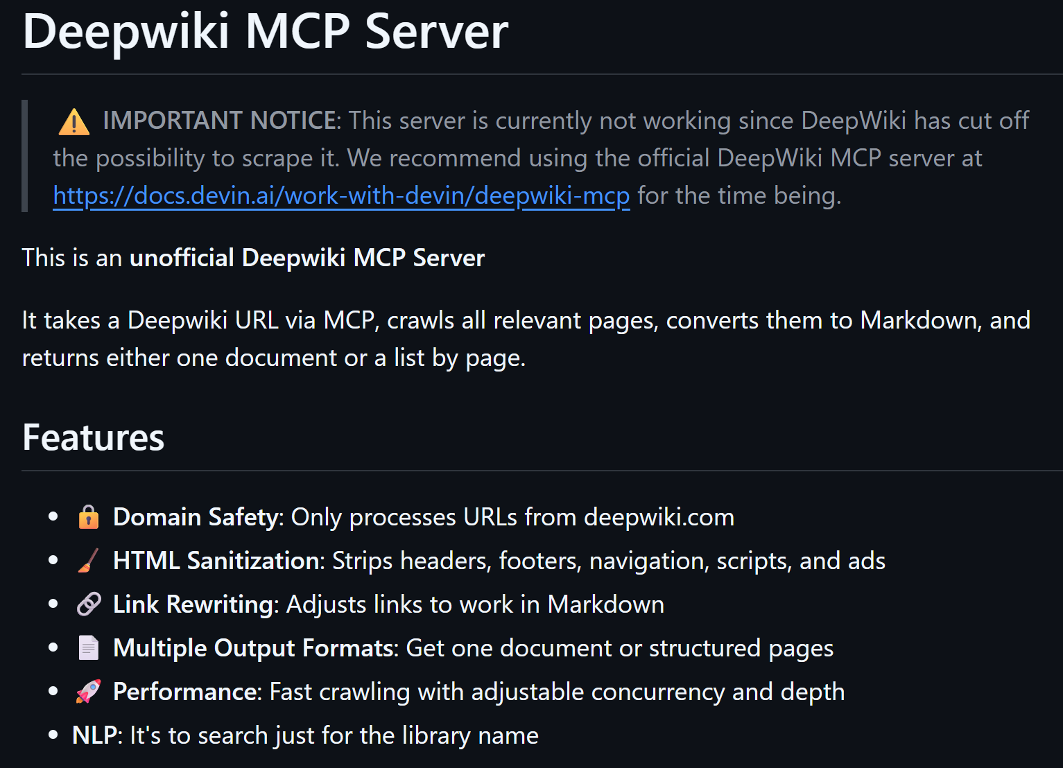 另外一个非官方的MCP服务,参考:https://github.com/regenrek/deepwiki-mcp