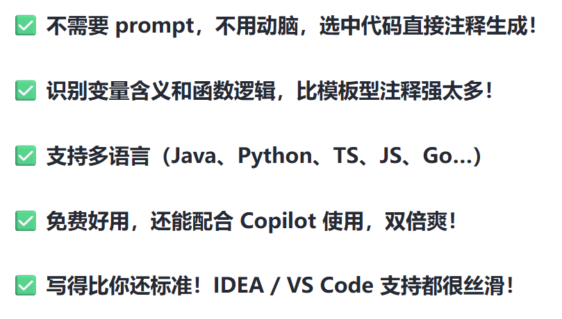 为你的 Java/Python/TS 等函数生成结构清晰、语义到位、开发友好的专业文档注释