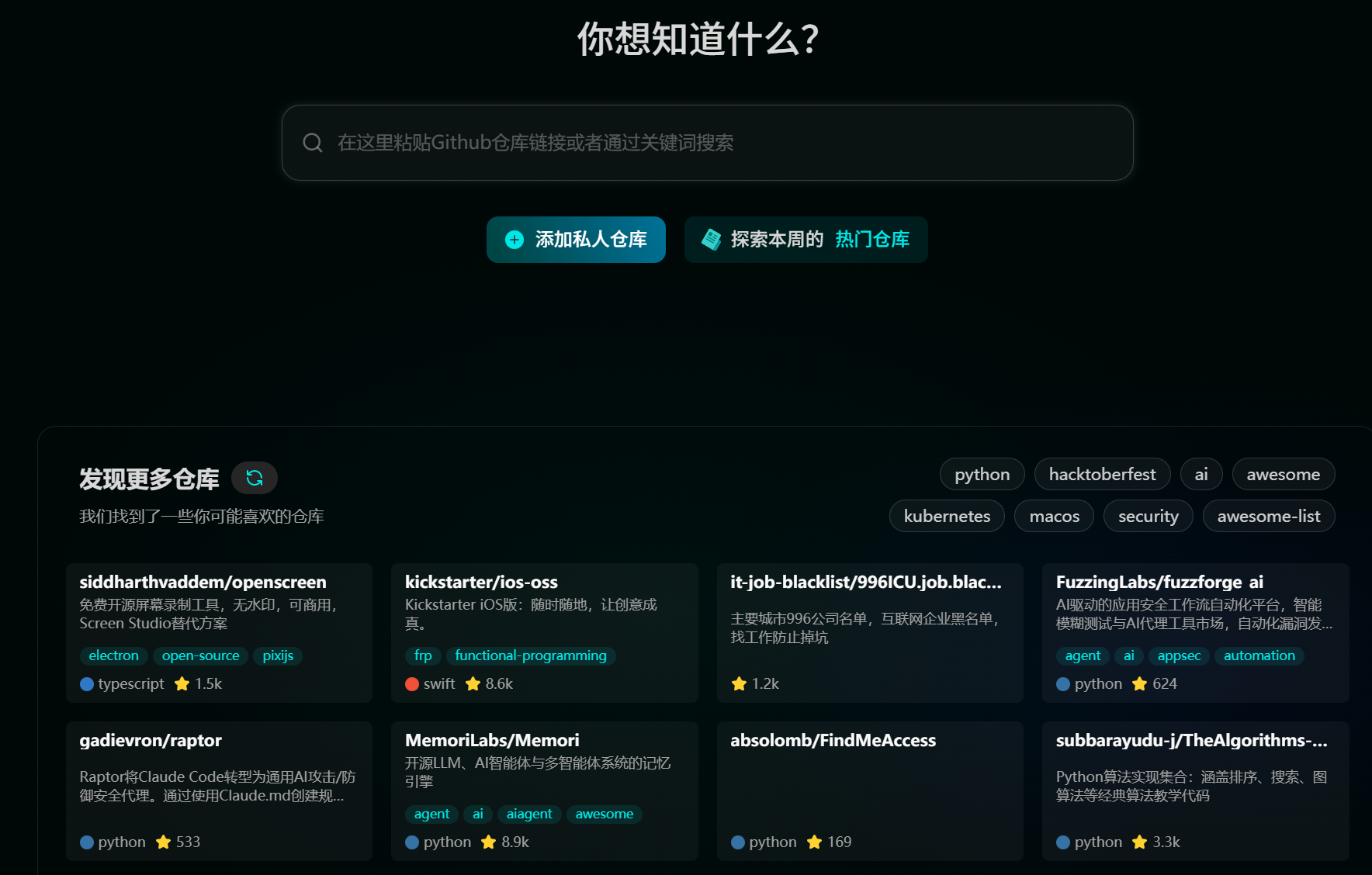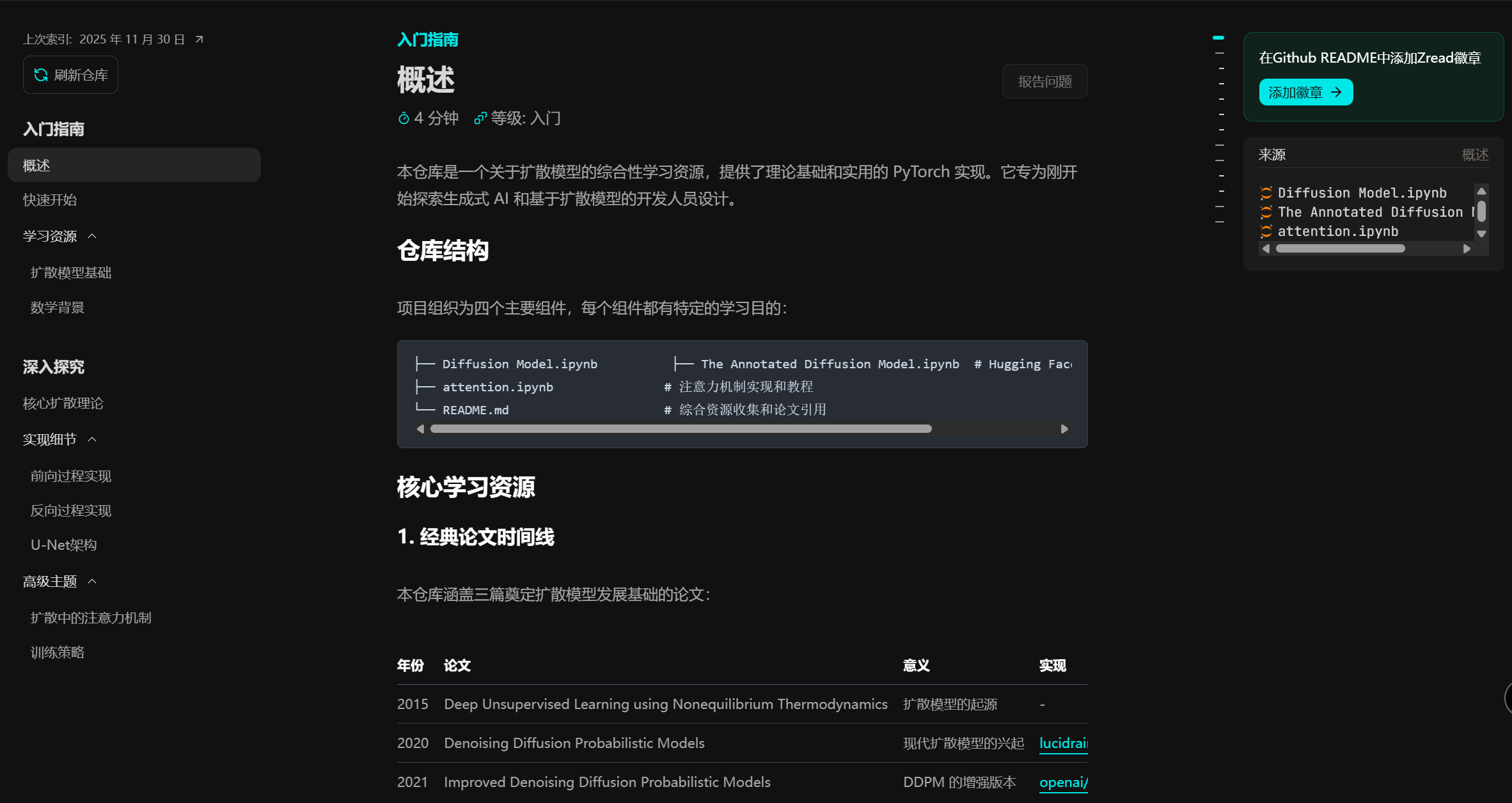 Zread.AI 的功能类似于 Cognition 推出的 DeepWiki,优点是支持中文(划重点),目前已经索引了大部分热门开源项目,冷门代码仓库可以申请发起索引。