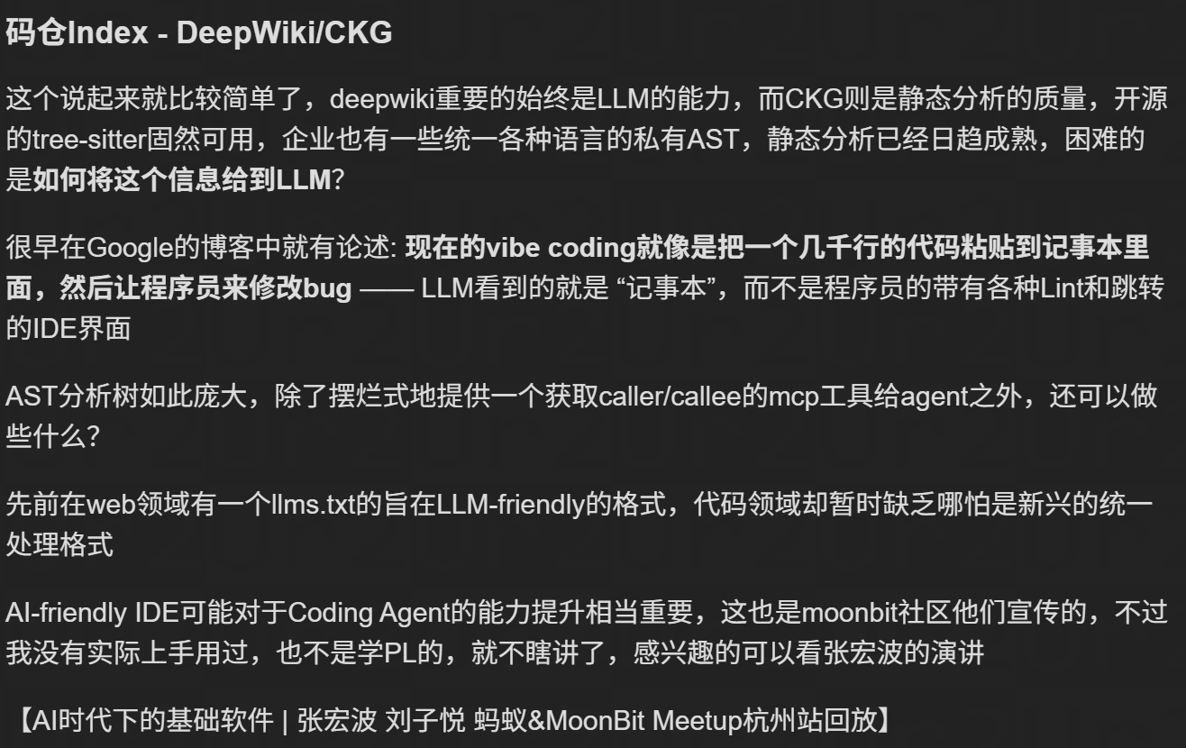 DeepWiki之类工具最重要的始终是LLM的能力,而静态的AST抽象语法树分析其实是已经比较成熟了,