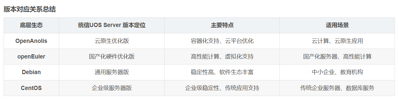 统信UOS Server 的不同版本可能基于 OpenAnolis、openEuler、Debian 或 CentOS 等开源生态,具体选择取决于应用场景和需求: