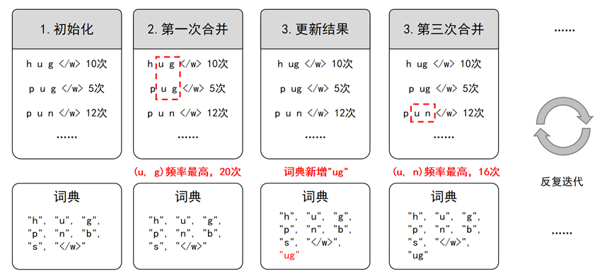 迭代合并:在整个语料库里,找出出现频率最高的相邻组合,比如 u 和 g 总是同时出现,就把它们合并成一个新的积木块 ug。