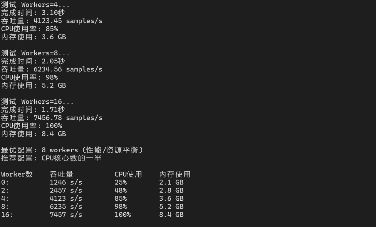 print(f"Workers={num_workers}: {throughput:.2f} samples/s")