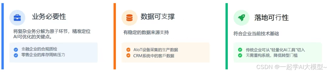 一个真正值得投入的企业 AI 需求,必须同时满足三大特征:业务必要性(解决真问题)、数据可支撑(有稳定的生产数据和客户数据可用)和落地可行性(符合企业当前的技术与系统基础)。