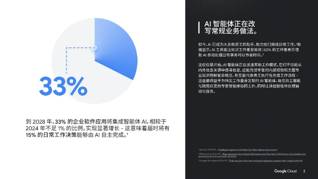 本手册《AI智能体手册》由Google Cloud发布,旨在展示如何利用AI智能体提升企业效率与创新能力。手册强调,AI智能体并非传统自动化工具或聊天机器人,而是能够执行复杂工作流、理解多源信息并代表员工完成任务的高级智能系统。预计到2028年,33%的企业软件将集成智能体AI,显著推动工作模式的智能化转型。