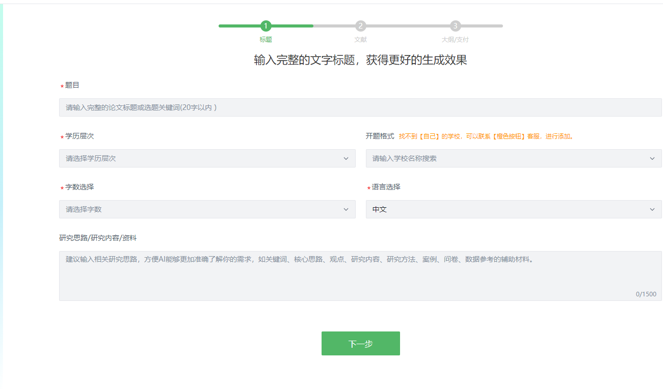 用户需输入完整标题,而非关键词。例如,“数字经济对乡村振兴的影响研究”被系统提示“过于宽泛”,而“数字普惠金融对豫南地区农户创业意愿的影响机制研究”则被接受。这一设计迫使用户在启动前即完成: