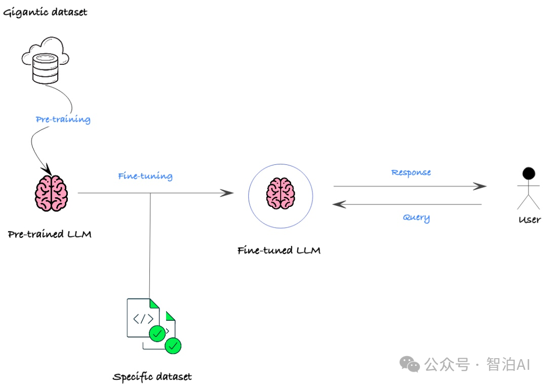 微调是在较小的、特定领域的数据集撒谎给你继续LLM的训练流程,这可以通过调整模型本身的参数,而不是像提示词工程和RAG那样仅仅更改提示词来大幅提高模型在特定任务中的性能,可以把微调的这个过程想象成:把通用工具打磨成精密仪器的过程。