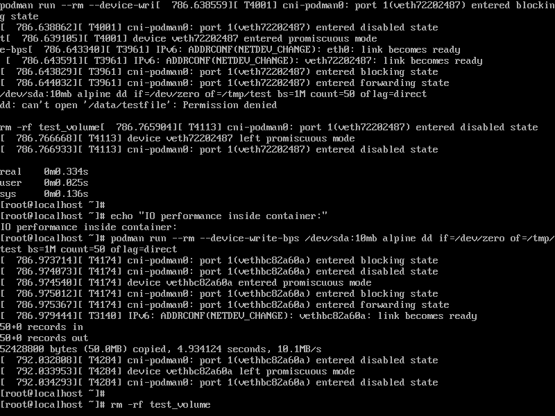 podman run --rm --device-write-bps /dev/sda:10mb alpine dd if=/dev/zero of=/tmp/test bs=1M count=50 oflag=direct