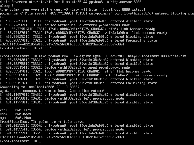 time podman run --rm alpine wget -O /dev/null http://localhost:8080/data.bin