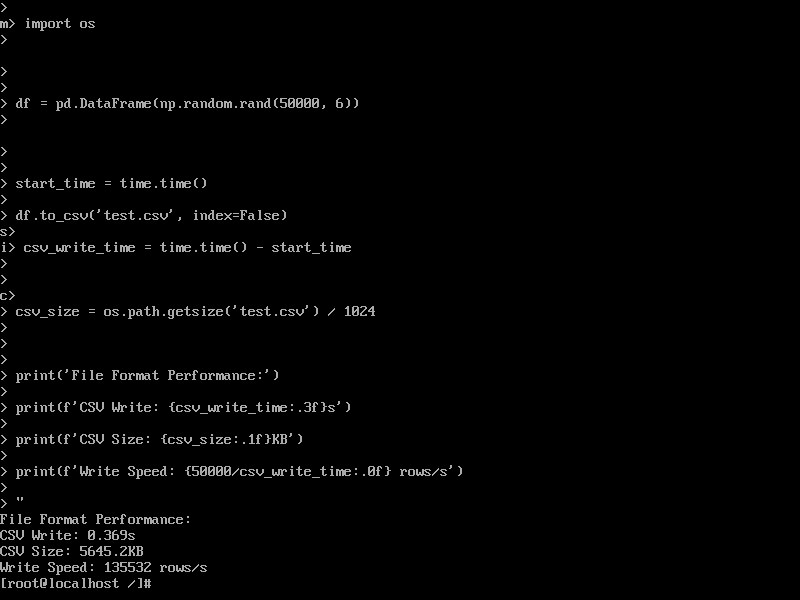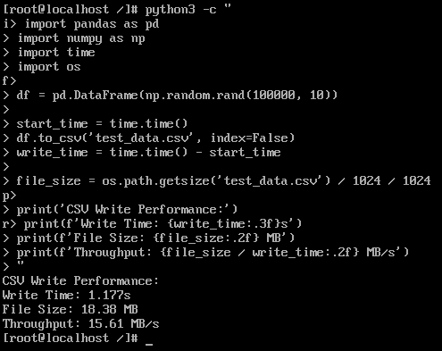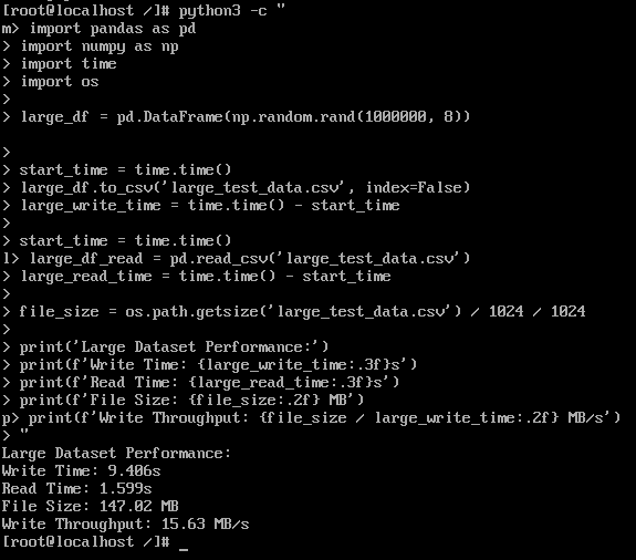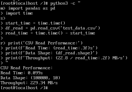 测试数据显示,openEuler在数据处理各环节展现出显著性能优势。数据生成环节耗时仅0.2秒完成10万行数据集创建,体现高效的内存管理机制。CSV文件读写性能表现突出,写入吞吐达15.61MB/s,读取吞吐达到229.34MB/s,反映系统在I/O调度和缓存管理方面的深度优化。