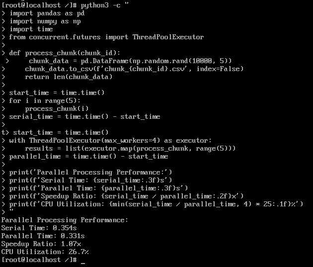 print(f'CPU Utilization: {min(serial_time / parallel_time, 4) * 25:.1f}%')
