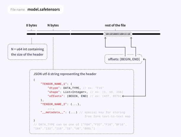 这是huggingface设计的一种新格式,大致就是以更加紧凑、跨框架的方式存储 Dict[str, Tensor] ,主要存储的内容为tensor的名字(字符串)及内容(权重)。