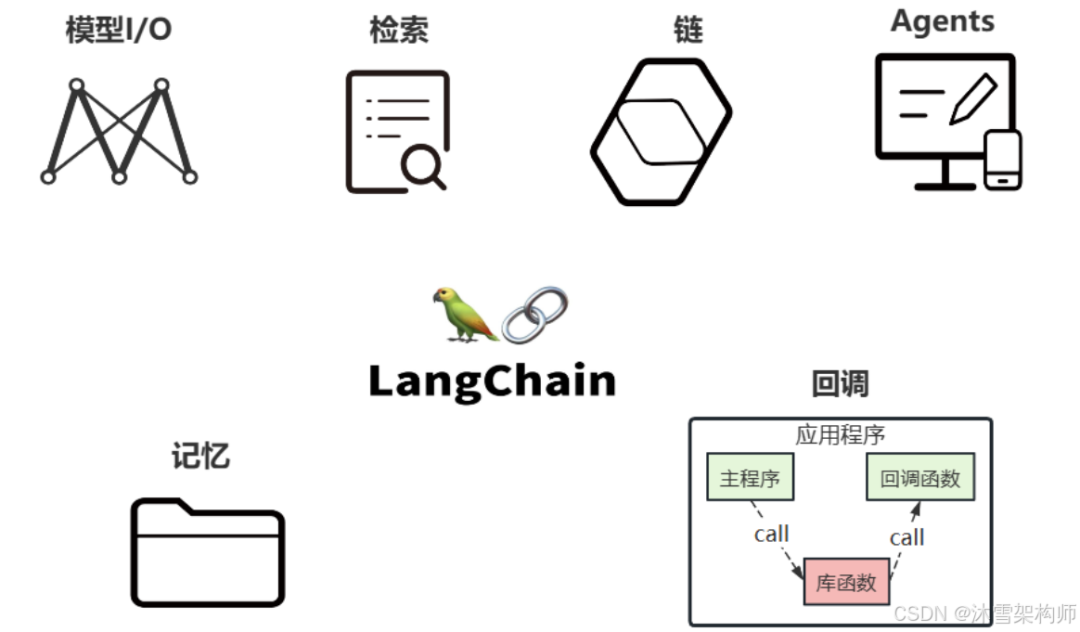 LangChain的核心组件涉及六大模块,这六大模块提供了一个全面且强大的框架,使开发者能够创建复 杂、高效且用户友好的基于大模型的应用。