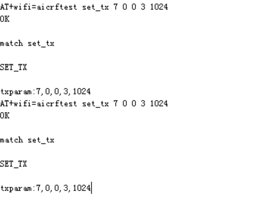 AT+wifi=aicrftest set_tx 1 0 0 3 1024 \\ 2412MHz,HT20,rate11M