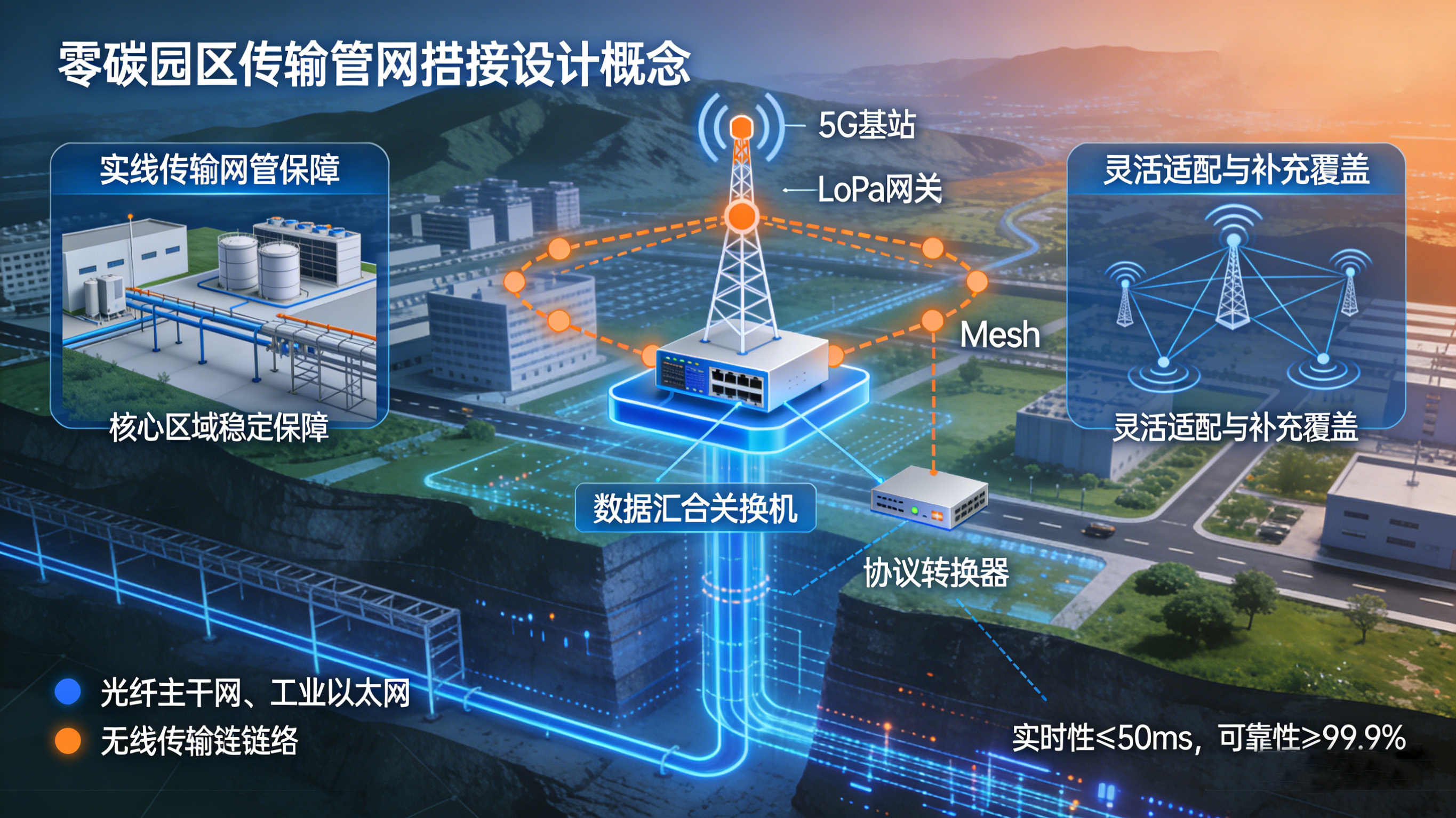 传输管网是连接IoT设备与核心数据平台的“信息高速路”,需结合园区地形、设备分布及传输需求,构建“有线为主、无线为辅、冗余备份”的衔接体系,确保数据传输的实时性(延迟≤50ms)与可靠性(传输成功率≥99.9%)。