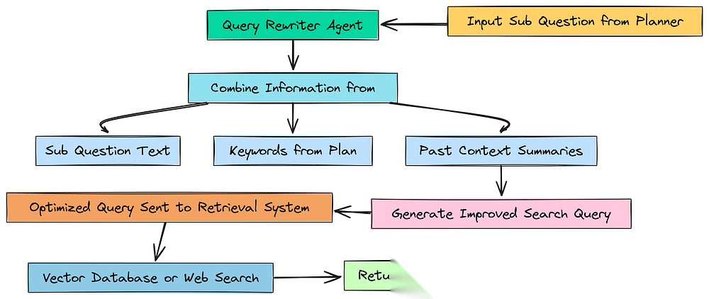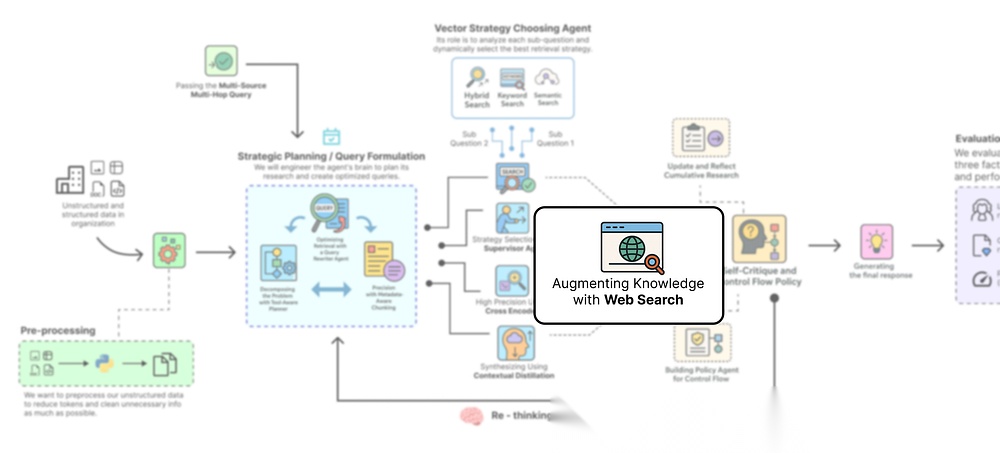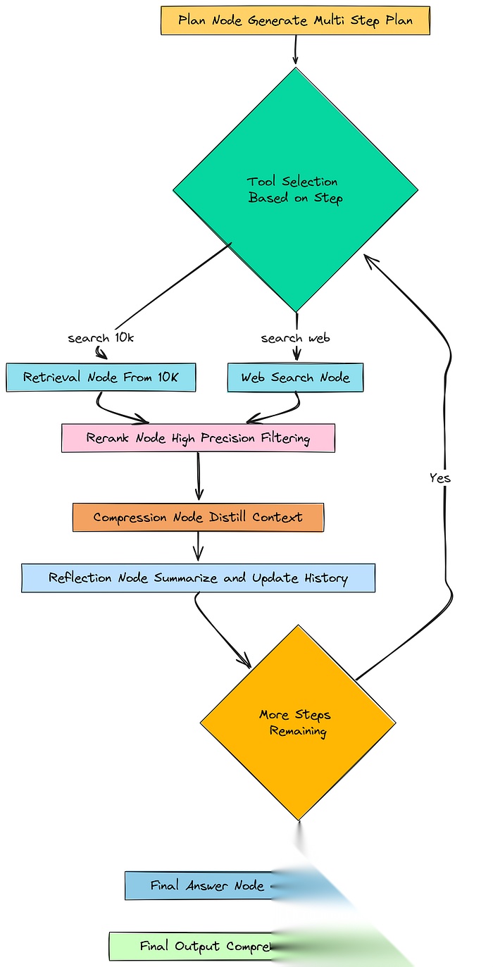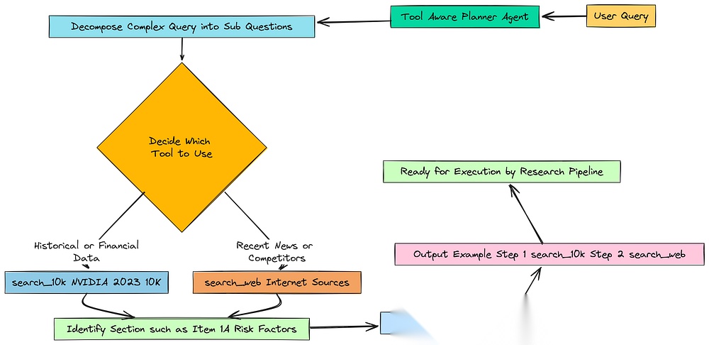 - 规划 (Plan): 首先,智能体将复杂的用户查询分解为一个结构化的、多步骤的研究计划,并为每一步决定需要使用哪种工具(内部文档搜索或网络搜索)。