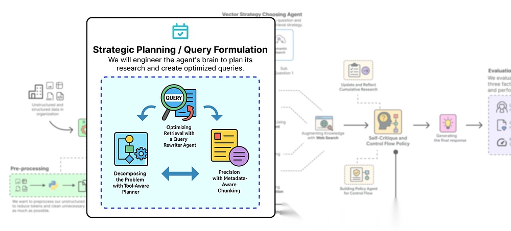 在定义了我们的 RAGState 之后,我们现在可以构建我们智能体的第一个,也可以说是最关键的认知组件:它的规划能力。这是我们的系统从一个简单的数据获取器跃升为真正的推理引擎的地方。我们的智能体不会天真地将用户的复杂查询视为单次搜索,而是会首先停下来思考,并构建一个详细的、分步的研究策略。