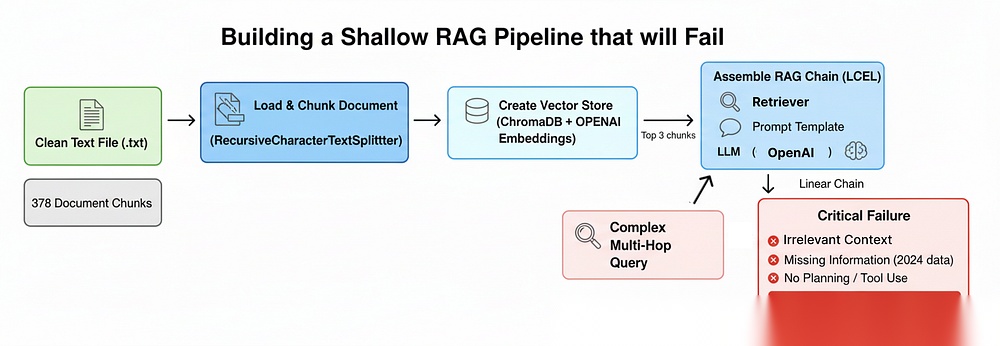 - • 展示关键失败点: 我们将用我们的多跳、多源查询来执行这个简单的系统,并分析其不充分的响应。