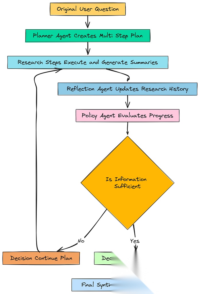 - 批判 (Critique): 然后,一个策略智能体(policy agent)会检查这段历史,做出战略决策:是继续下一步研究,还是在遇到死胡同时修正计划,或是结束任务。