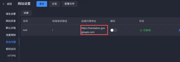 主域名设置为http://mt.yourdomain.com,前端请求路径为/,后端代理地址是https://translation.googleapis.com。