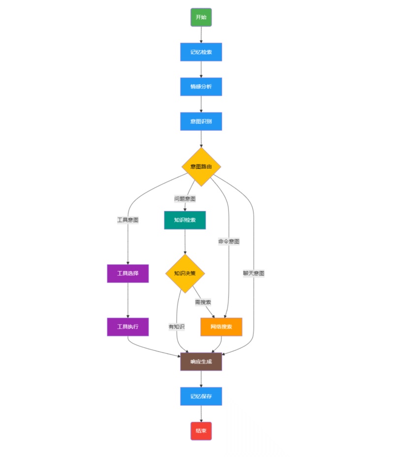 指令:根据对用户意图识别(例如:天气、新闻、查找附近、翻译等),调用搜索工具进行实时查询,利用 DeepSeek-V3 大语言模型将实时查询数据、用户情绪、结合上下文信息(对话记忆)进行 RAG 增强的自然对话响应。