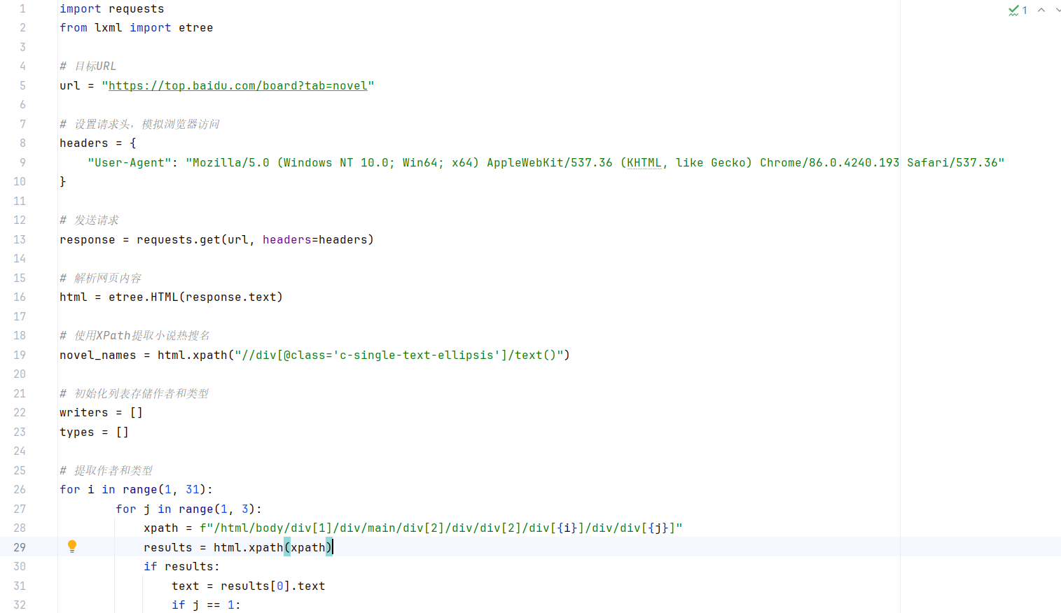 代码就是这个代码,依旧是发送请求,获得响应,解析网页(用xpath解析),定位目标位置(用xpath方法),获取信息,打印信息。虽然简陋了一点,但不影响现在学习。