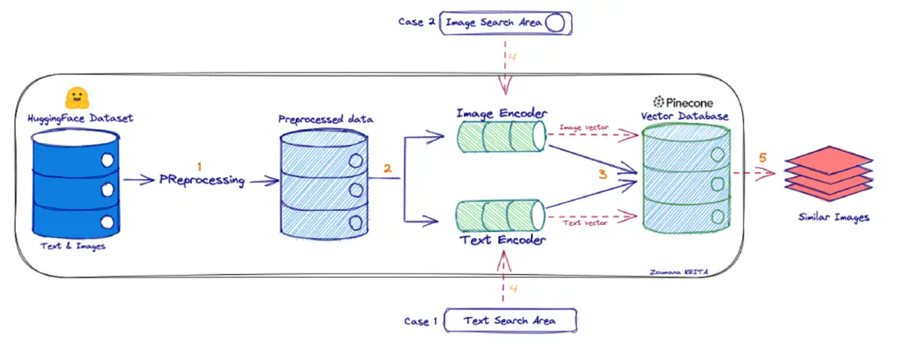 ② 并行查询:用户输入“一段描述文字 + 一张参考图片”,系统会同时用文字去搜文本库,用图片去搜图片库。