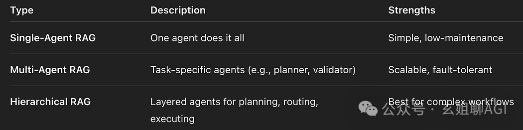 架构变化决定了 RAG AI 智能体是如何组织的——单智能体用于简单性,多智能体用于模块化,以及分层用于管理复杂工作流程中的分层、多阶段任务。