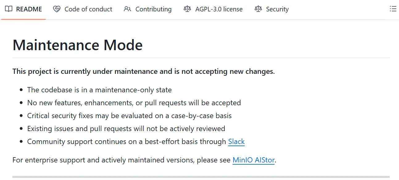 MinIO 官方 GitHub 仓库宣布更新项目状态为 “维护状态(Maintenance Mode)