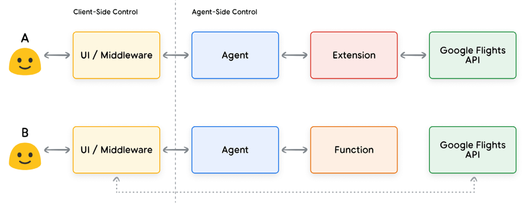 - Extension 方式:通过示例和参数格式,Agent 自动选择并调用 API。