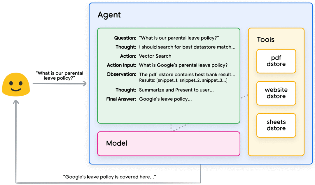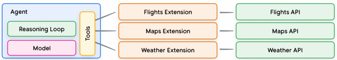 - 工具使用:Agent 通过工具连接现实世界,主要包括 Extension(后端闭环调用)、Function(前端控制函数)、Data Storage(知识记忆与检索)。